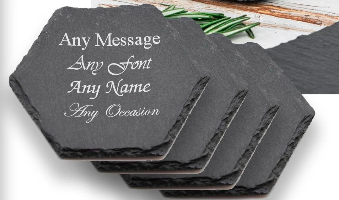 Need your logo on a marketing gift , or want to make a personalized gift for a loved one? Now you can, with a custom engraved black slate square coaster set. Great for company giveaways/souvenirs as well as personal touch gifts.