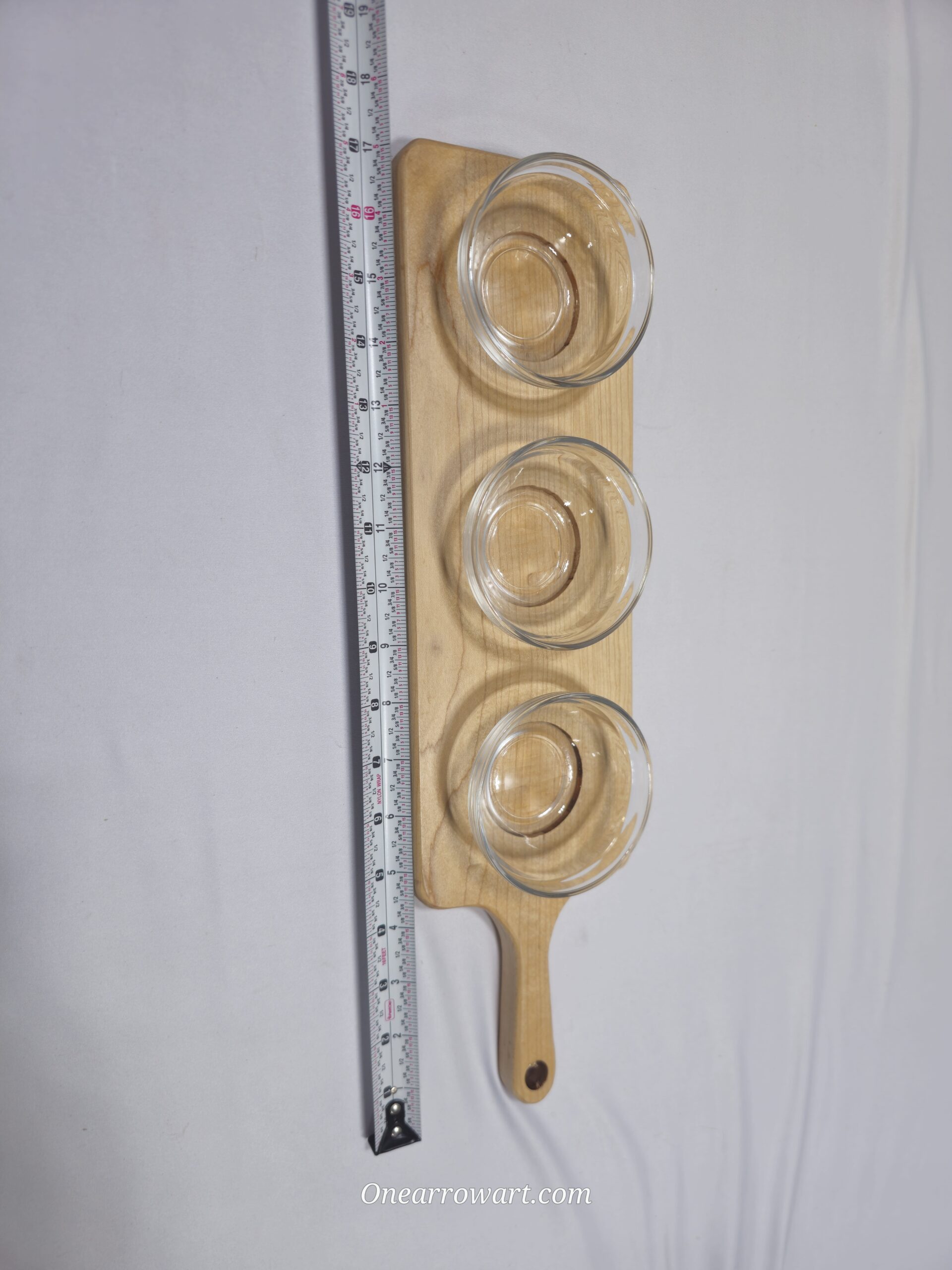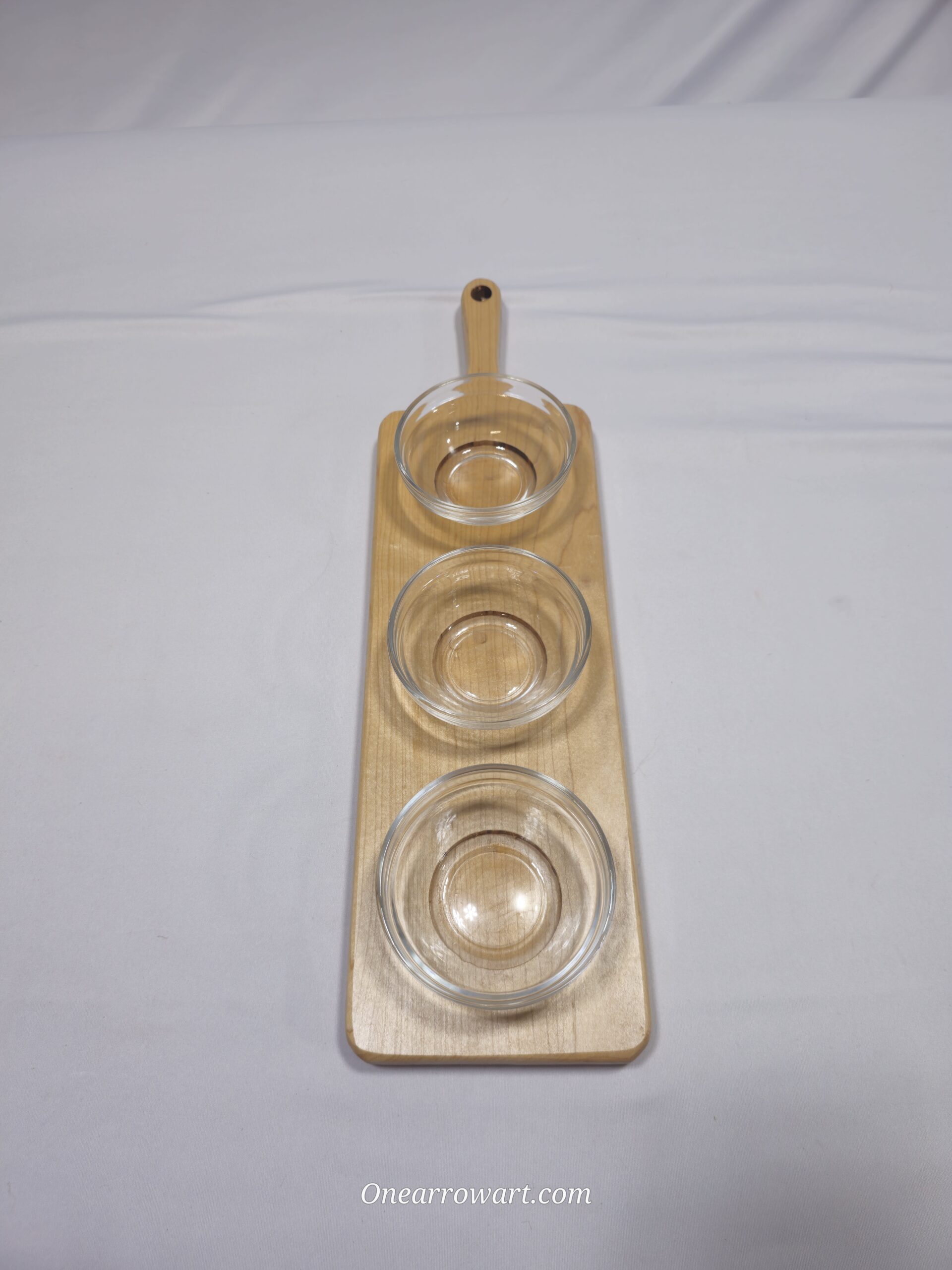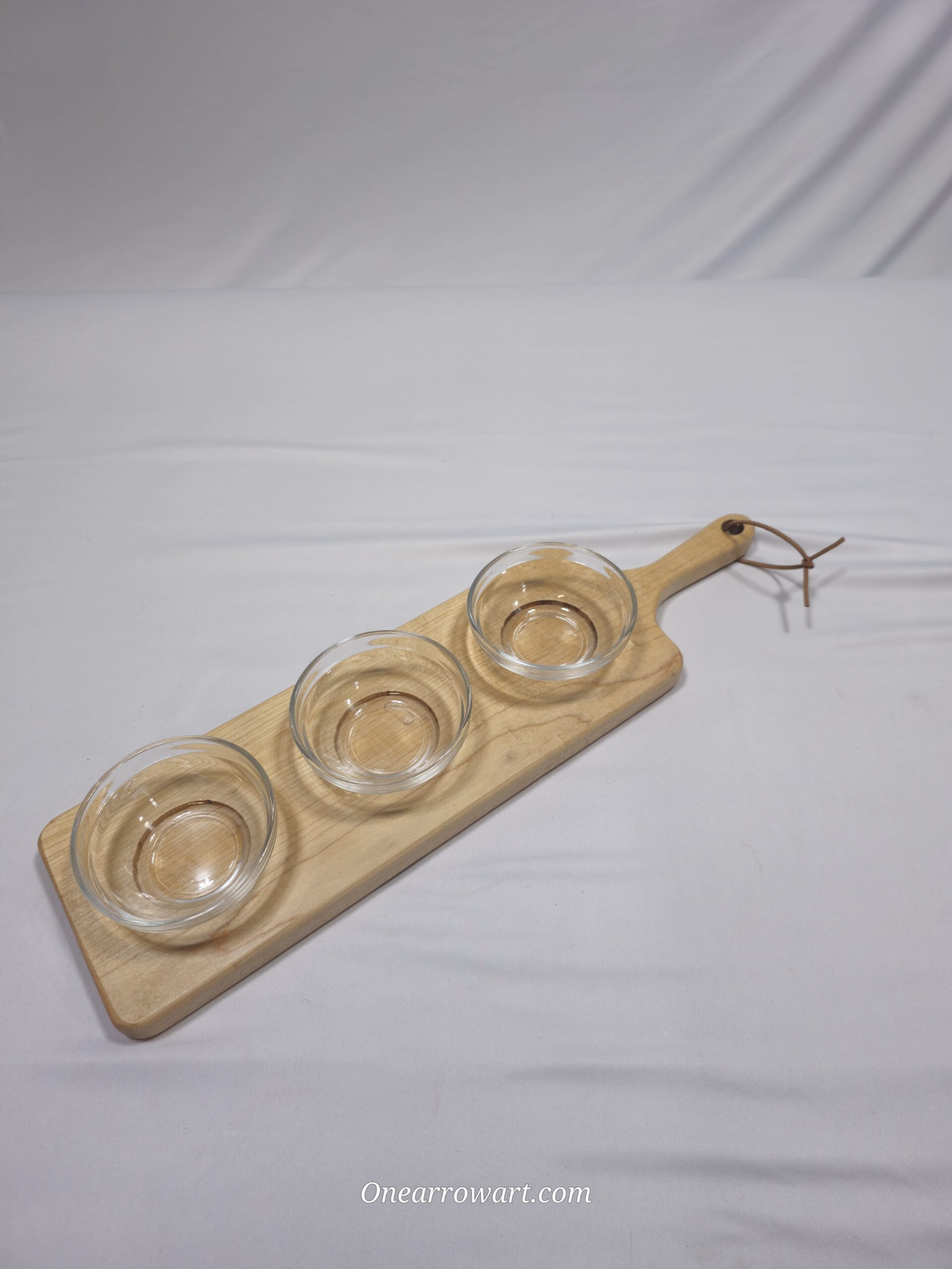 17″ x 4.5″ Solid Maple 3 bowl serving plater with handle and leather tie.