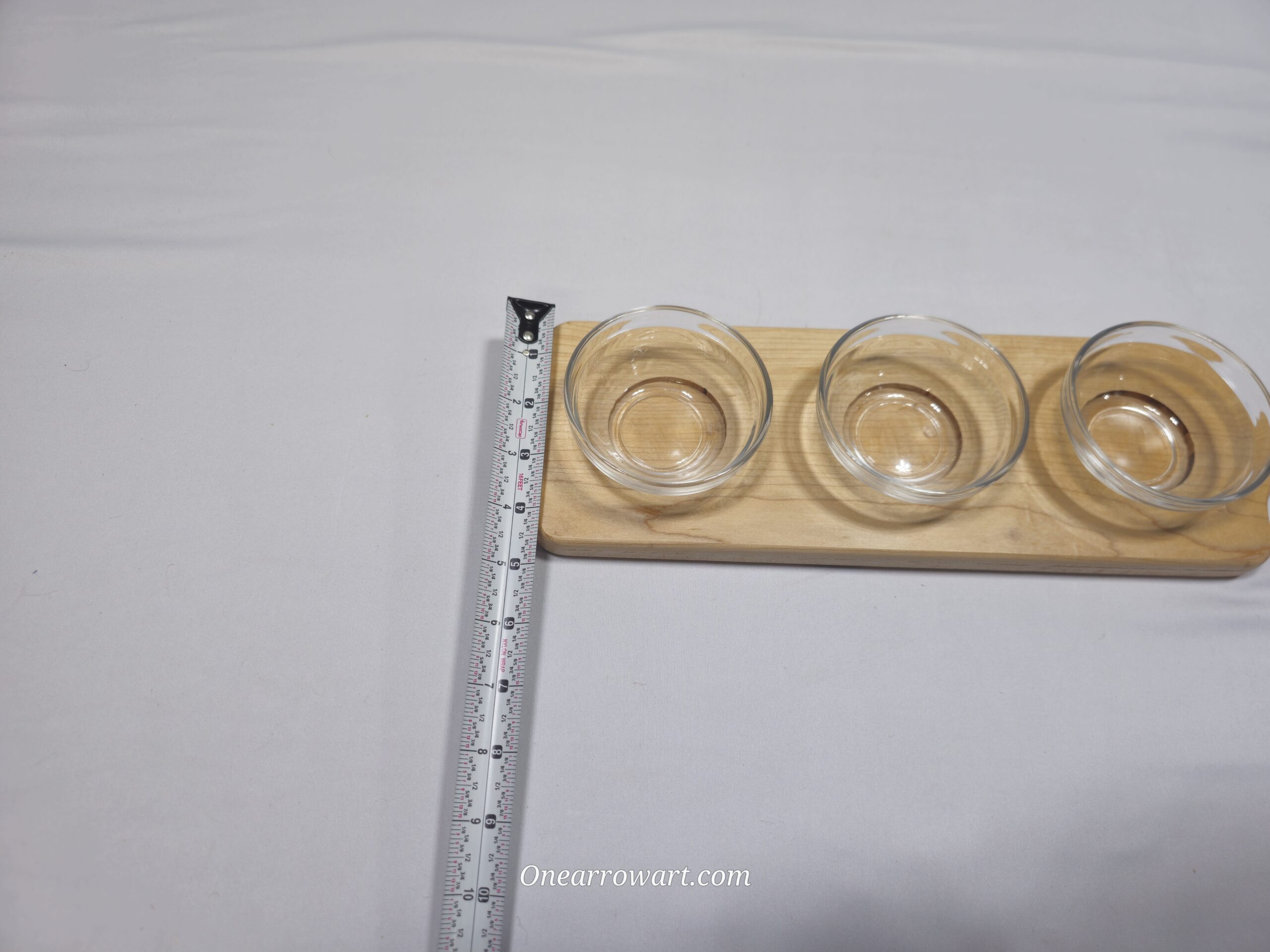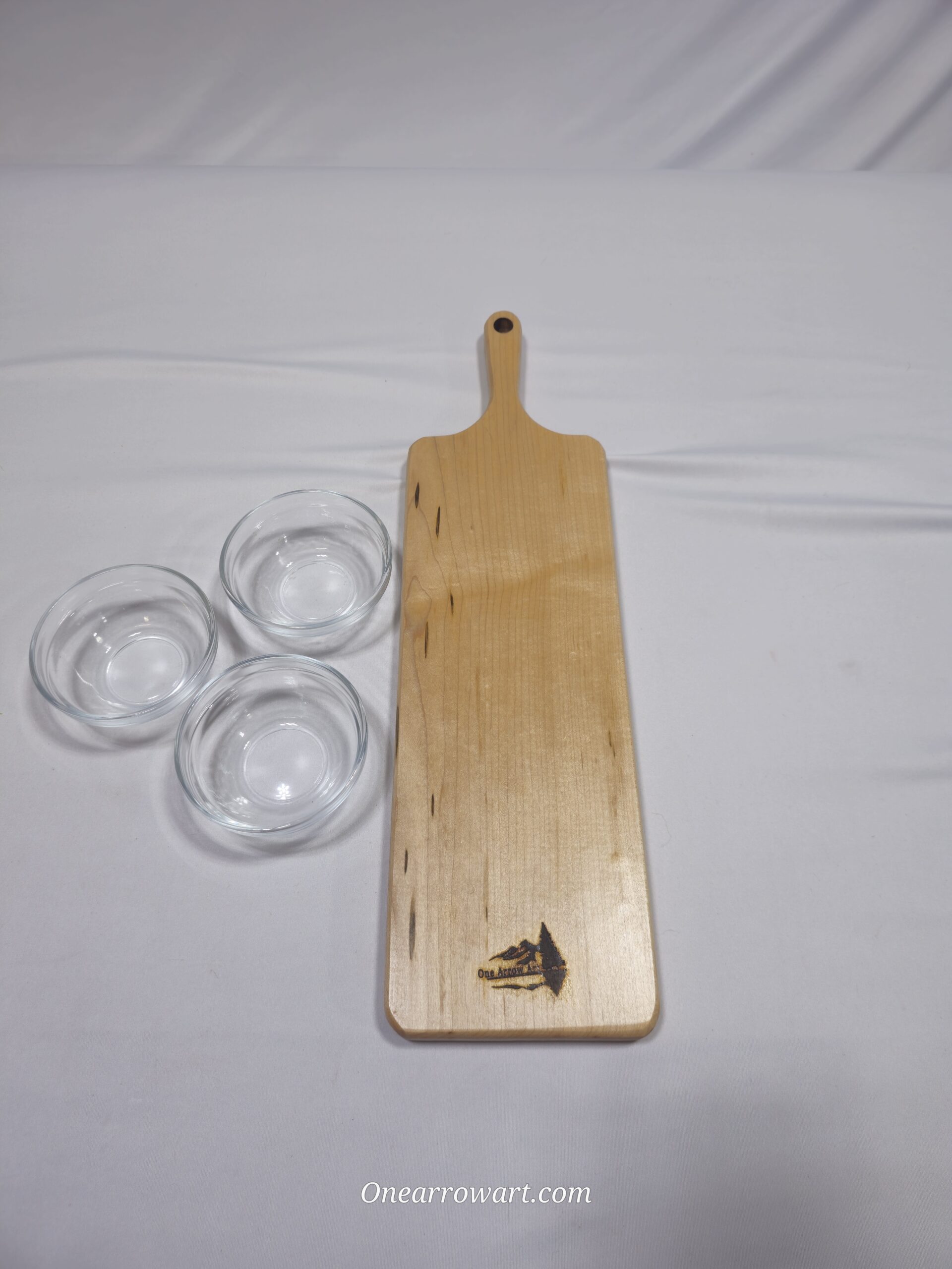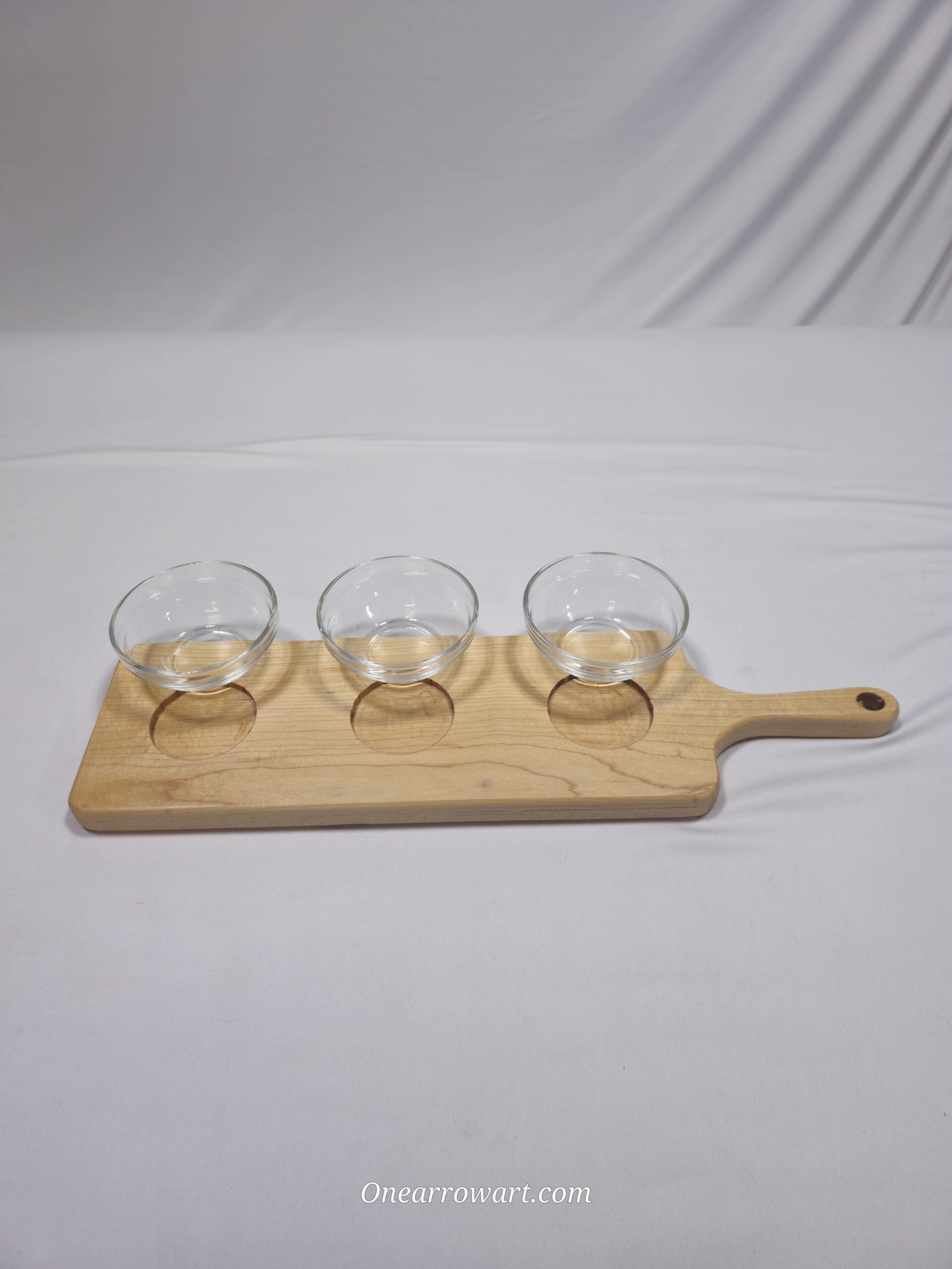 17″ x 4.5″ Solid Maple 3 bowl serving plater with handle and leather tie.